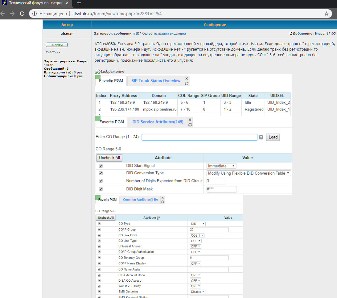 по этим скринам что я приложил не понятны настройки? даже на знаю как еще описать, вроде все просто: 1. PGM 126 в SIP User ID Index 3 указываем любой Registration User ID, User ID Register ставим в Provosion. Ring Route Type - DID Conversion, DID conversion Type - Use 'as is', Number of Digits Expected from DID Circuit - 3; 2. PGM 133 прописываем адрес Proxy и Domain. Registration UID Range ставим из PGM 126 (3); 3. PGM 140 CO Type DID; 4. PGM 145 DID conversion Type - Use 'as is', Number of Digits Expected from DID Circuit - 3. Нумерация на eMG80 3-х значная. Вопрос почему eMG80 не реагирует на входящие invait-ы с 3-х значными номерами в поле to, где я что упустил? |