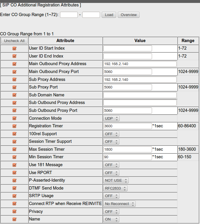 SIP CO User ID Table(373)[N] пустые и я не трогал их, SIP CO Allowed Address(374)[N] --> вписан только адрес Asterisk
