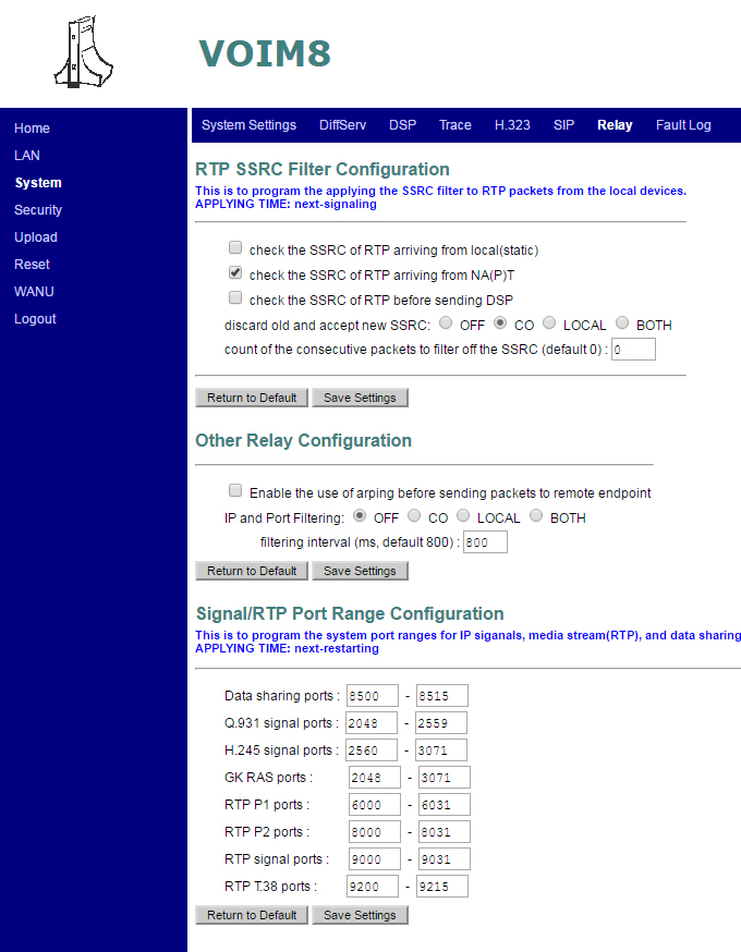 Во вложении скриншоты настроек. И вот конфиг маршрутизатора. Пробросить на данном маршрутизаторе возможно только 256 портов. По этому сделать все пробросы, согласно скриноту с VOIM8 не получиться.